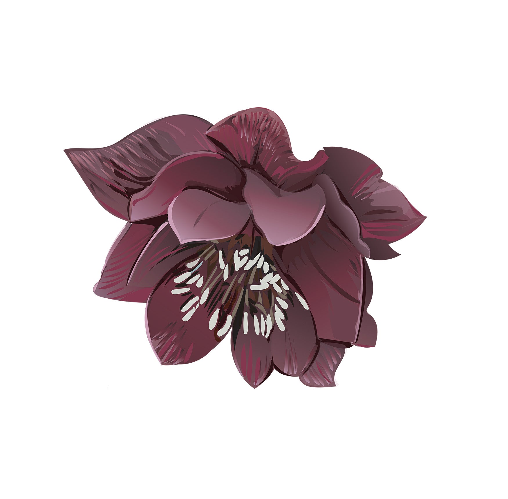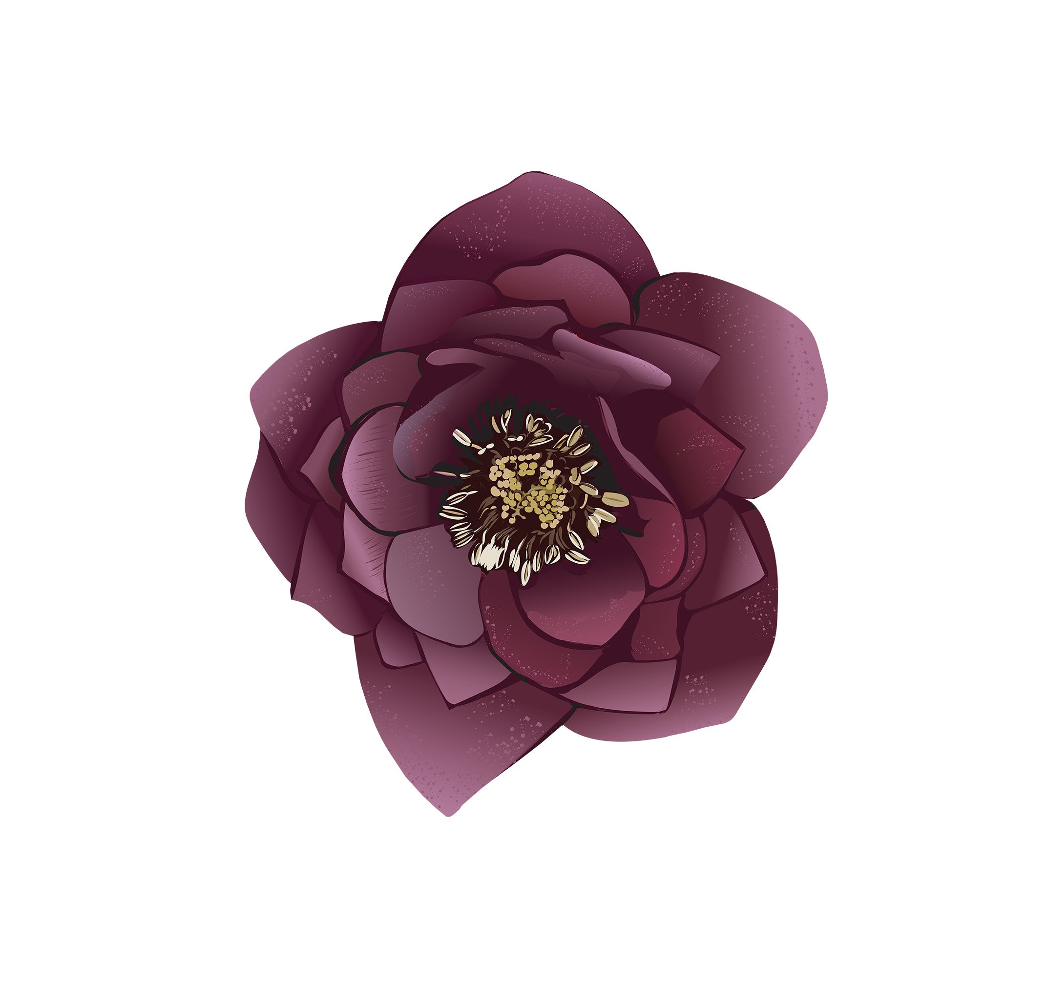 Deep burgundy hellebore. Each petal has subtle shading and tiny speckled textures, which add depth. The centre of the flower is detailed with pale yellow and cream stamens clustered tightly together, creating a strong contrast with the dark petals.